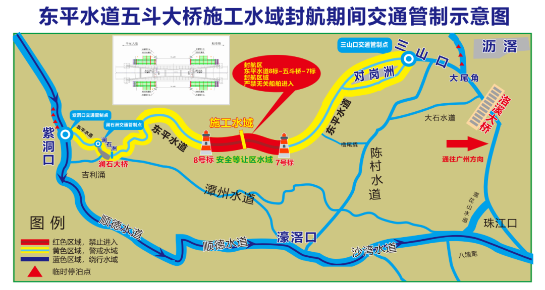 为保障东平水道五斗大桥重建项目施工期间通航环境安全,海事部门将于7月五斗大桥吊装施工作业期间对东平水道相关水域实施封航交通管制。