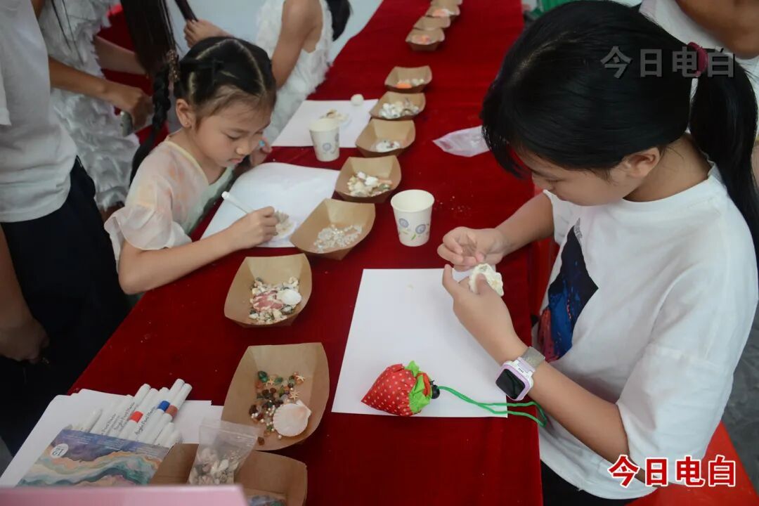 手工体验区同样人气高涨。在非遗香囊手工区,大家仔细挑选心仪的香料与草药,指尖轻捻间满是对气味的细致考量,将驱邪避秽、祈福安康等美好心意一同亲手塞入绣工精巧的香囊中,让每一件手作都成为承载心意的独特信物。在贝雕非遗手工DIY冰箱贴区,大家捏泥塑形打基底,打磨贝壳显温润,再精心拼贴组合。创作巧妙融入电白海洋文化元素,七夕浪漫与海洋韵味交织,最终制成特色艺术品。一件件手作既传承海洋文化,又为七夕增添独特温情与文化底蕴。