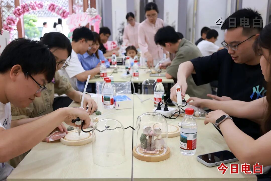 青年男女两两结对,凝神打磨贝壳边缘,细心勾勒图案轮廓。遇有难题时,男生主动协助调整刻刀角度,女生耐心提醒细节要点,默契在指尖流转,情意随刻痕渐生。近一小时后,一件件饱含心意的贝雕作品新鲜“出炉”——灵动的“好事成双”、精致的“心心相印”、吉祥的“双喜迎春”,既承载着非遗文化的厚重底蕴,更凝结着青年间的真挚情谊,让大家在沉浸式体验中深切感受家乡传统文化的独特魅力。