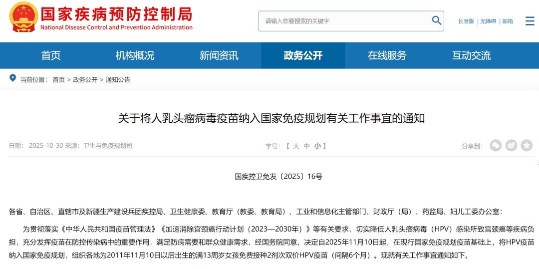 10月30日,国家疾控局、国家卫生健康委等七部门发出通知,经国务院同意,将人乳头瘤病毒疫苗也就是HPV疫苗纳入国家免疫规划河源华锋,自2025年11月10日起,组织各地为2011年11月10日以后出生的满13周岁女孩免费接种2剂次双价HPV疫苗(间隔6个月)。