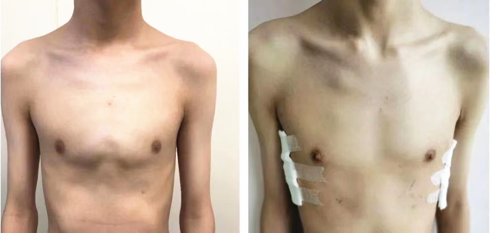 漏斗胸表现为部分胸骨、肋软骨及肋骨向脊柱呈漏斗状凹陷的胸壁畸形。凹陷的胸廓不仅影响孩子的外观,还可能对心肺功能造成压迫,导致孩子活动耐力下降、容易疲劳,甚至出现心慌、气短等症状。